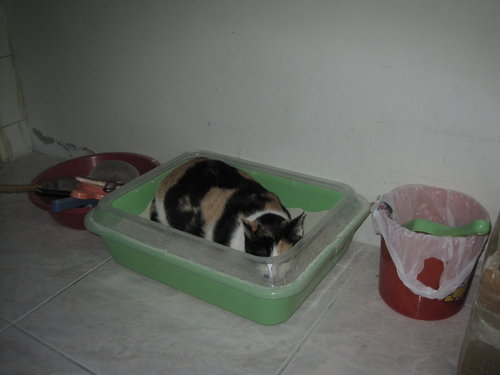 貓到新地方都會不安,經驗老道的花媽媽也不例外,牠來了之後馬上躲到我弟房間的床底下----這是所有的貓來到第一天會躲的地方,然後一直喵喵叫。